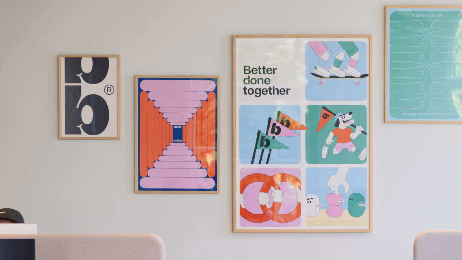 Bij Bunch werken we volgens het done-with-you principe. Door disciplines te bundelen en in-house teams te activeren, bouwen we samen met onze opdrachtgevers aan merken die blijven werken. Want écht partnerschap stopt niet als het merk staat. Daar begint het pas. We geven trainingen en werken met playbooks, zodat je team zélf door kan bouwen aan jullie toekomstbestendige merk.